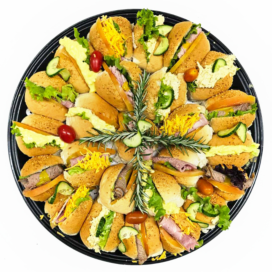 Fresh cocktail bread rolls loaded with ham, cheese and tomato, chicken mayonnaise, lettuce and cucumber, ham, tomato, and gherkins, and chicken and lettuce.
