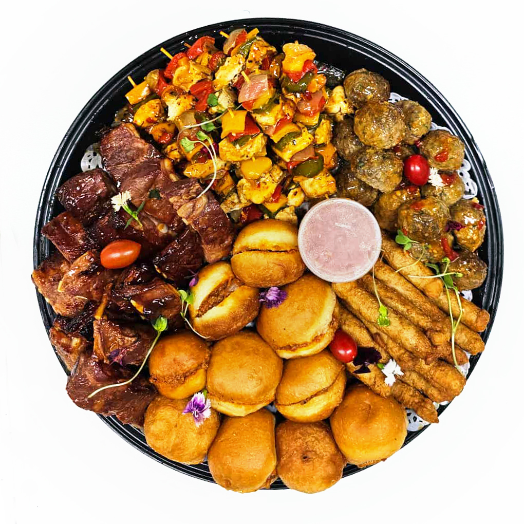 A perfect snack platter for the rugby with saucy chicken kebabs, tasty meatballs, mini vetkoek, cocktail chicken sausages and tender ribs.